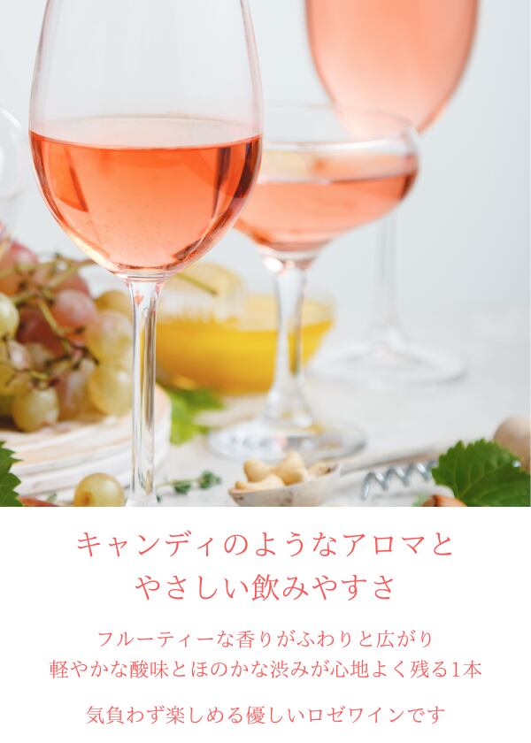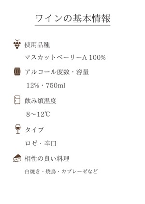 新潟県発の黒ぶどう品種、マスカット・ベーリーAを100%使用し、苺・ラズベリー・アメリカンチェリーを思わせる、ジューシーで甘やかな香りが魅力のロゼワインです。