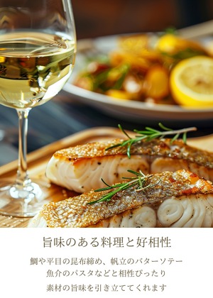 昆布締めの鯛や平目、帆立のバターソテー、魚介たっぷりのパスタなど、旨味のしっかりとした料理にぴったり。熟成魚を使った押し寿司にも好相性です。