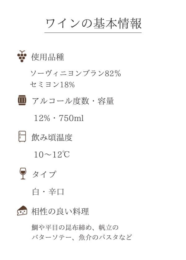 日本海を見下ろすミネラル豊富な土壌で育ったぶどう品種:ソーヴィニヨン・ブランとセミヨンを使用。ステンレスタンクと旧フレンチオーク樽での熟成により、果実のふくよかさと澄んだ味わいを引き出しました。