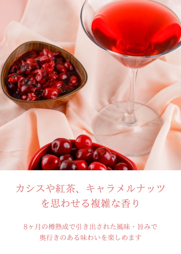熟成はフランス産のオーク材で作られたフレンチオーク樽を使用し、約8ヶ月間じっくり熟成。