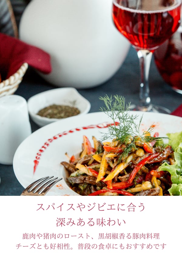 ジビエや黒胡椒を効かせた豚肉料理を始め、中華料理やチーズとのペアリングもおすすめ。洗練された香りと落ち着きのある味わいで、特別なひとときを豊かに彩ります。