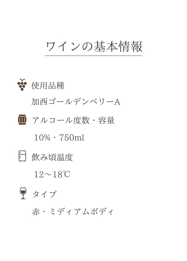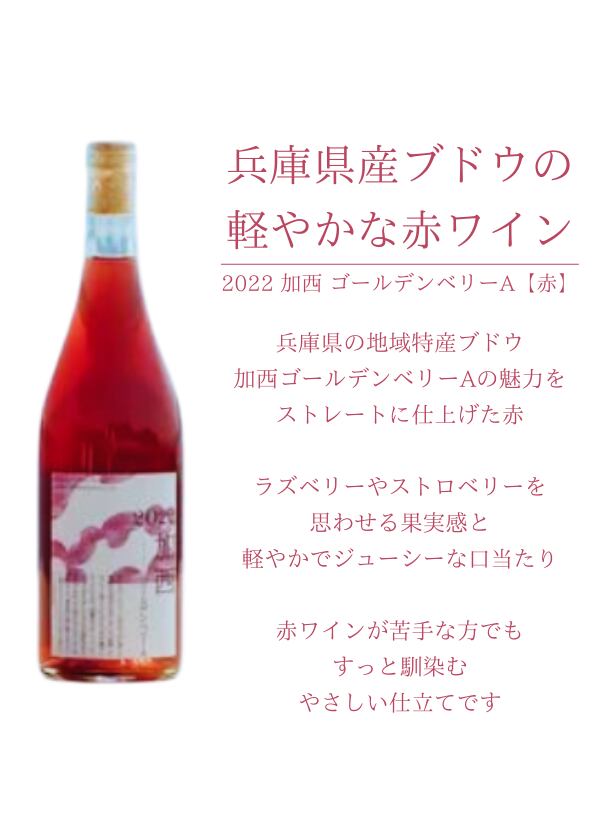 2022 加西 ゴールデンベリーA【赤】は、兵庫県加西市の特産ぶどう「ゴールデンベリーA」を100%使用した、軽やかでジューシーな味わいの赤ワインです。