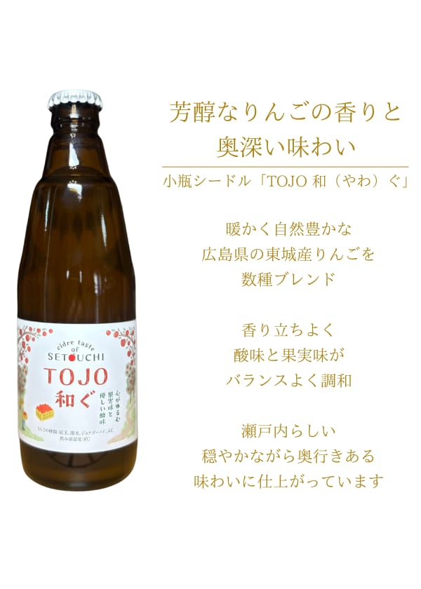 広島県・庄原市東城町で収穫されたりんごを使用し、「SETOUCHIを旅するシードル」シリーズのひとつとして造られたクラフトシードル「TOJO 和ぐ(やわぐ)」